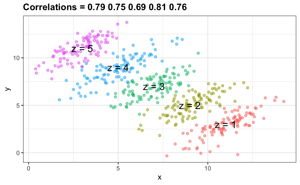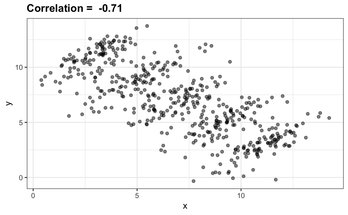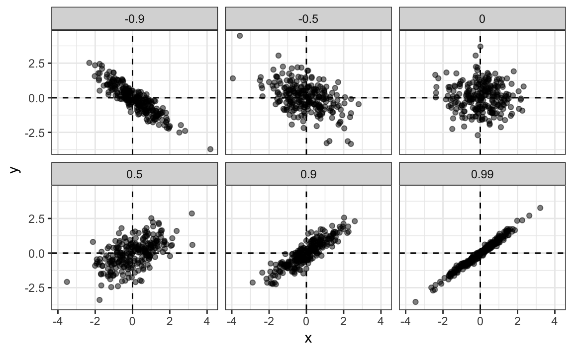 Para añadir líneas de regresión a los gráficos, necesitaremos la fórmula anterior en la forma: \(y=b+mx\), con pendiente \(m=\rho \sigma_y / \sigma_x\) e intercepto \(b=\mu_y - m \mu_x\)