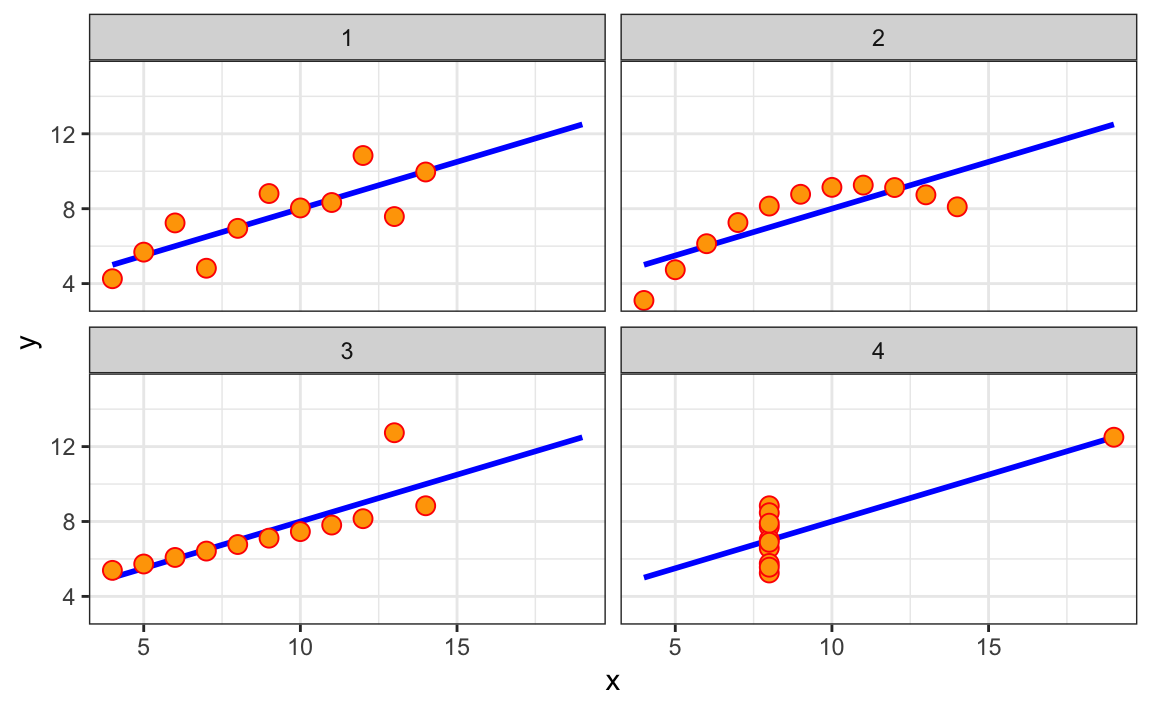 Entonces, ¿por qué no usar siempre la regresión para predecir? Porque no siempre es apropiado. Por ejemplo, Anscombe proporcionó casos en los que los datos no tienen una relación lineal. Entonces, ¿está justificado usar la línea de regresión para predecir? Galton contestó esto de forma afirmativa para los datos de altura.
