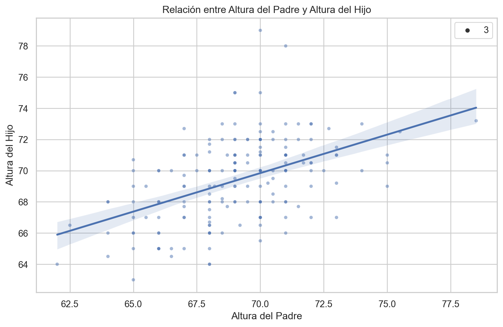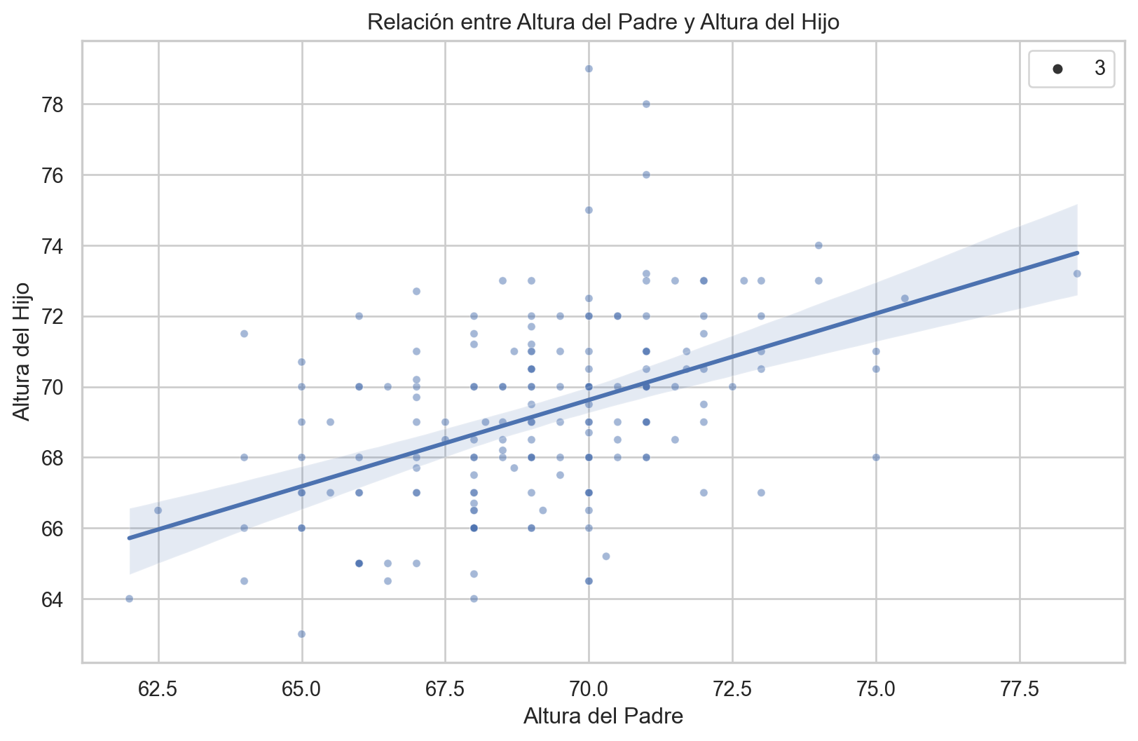 Calculamos una línea de regresión para predecir la altura del hijo desde la altura del padre.