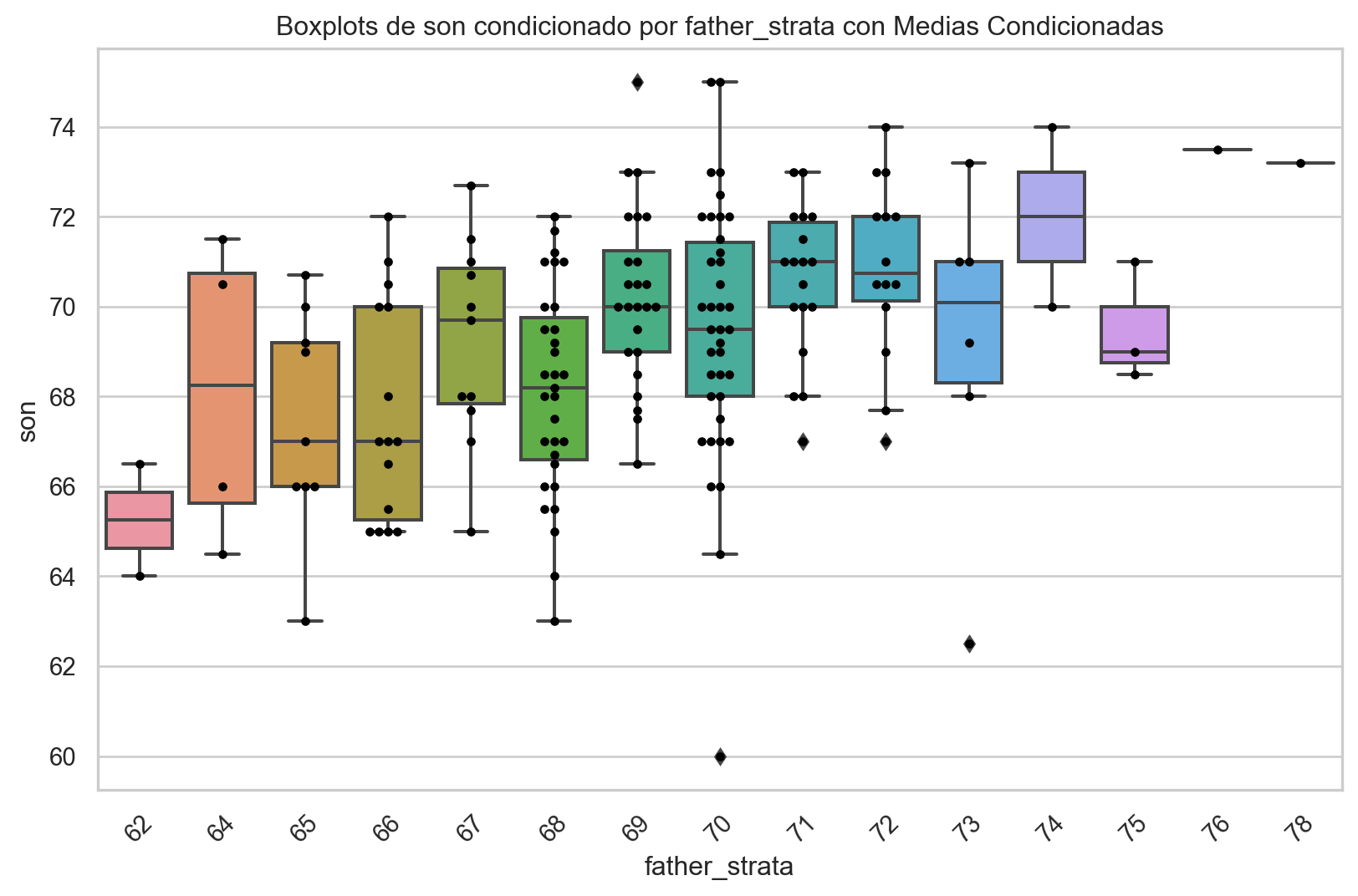 import pandas as pdimport numpy as npimport scipy.stats as statsimport matplotlib.pyplot as pltimport seaborn as sns# Supongamos que tienes un DataFrame llamado 'galton_heights' con las columnas 'father' y 'son'.# Estandarizar las alturas del padre y crear una columna 'z_father'galton_heights['z_father'] = np.round((galton_heights['father'] - galton_heights['father'].mean()) / galton_heights['father'].std())# Filtrar las alturas del padre dentro del rango [-2, 2]galton_heights_filtered = galton_heights[galton_heights['z_father'].isin([-2, -1, 0, 1, 2])]galton_heights_filtered.head()