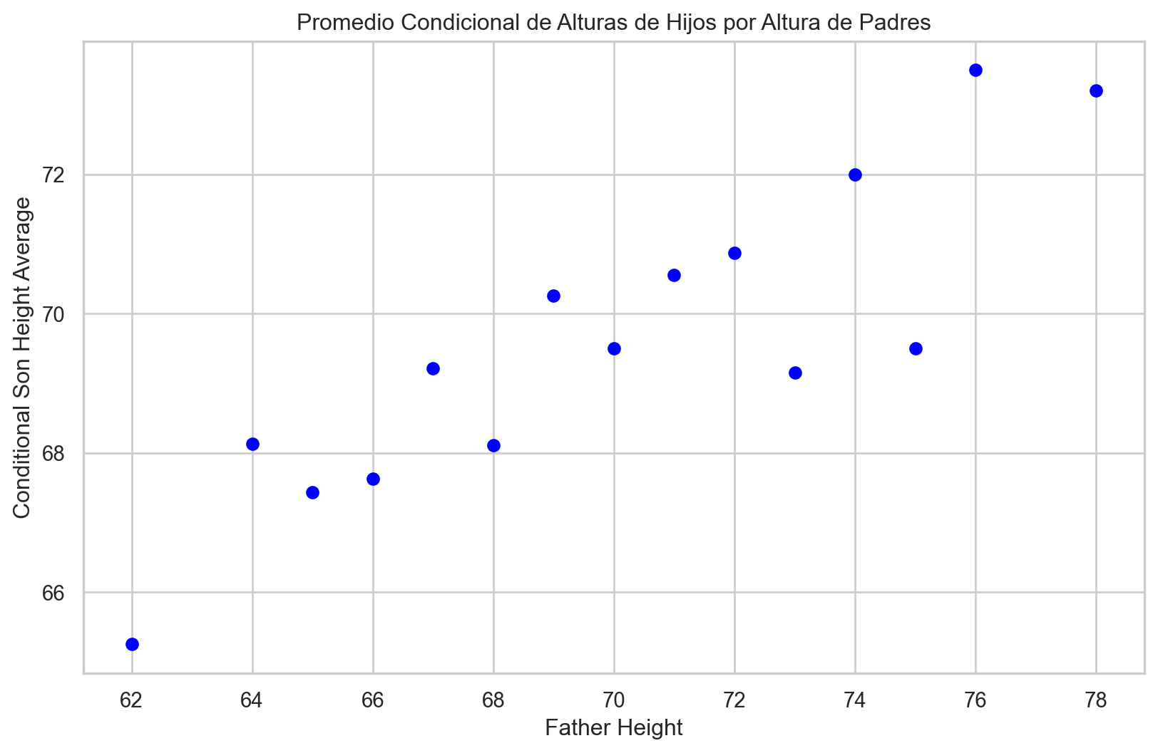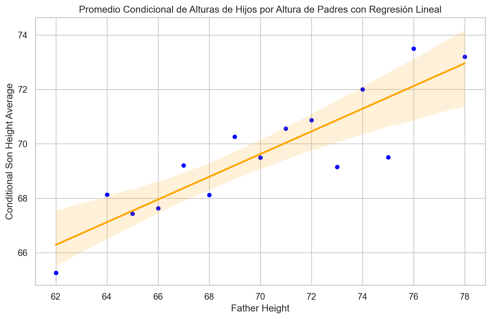 import pandas as pdimport matplotlib.pyplot as pltimport seaborn as sns# Redondear los valores de la columna "father"galton_heights['father'] = galton_heights['father'].round()# Calcular el promedio condicional de "son" para cada valor de "father"conditional_avg_by_father = galton_heights.groupby('father')['son'].mean().reset_index()conditional_avg_by_father.head()# Crear un gráfico de puntos con ajuste de regresión linealplt.figure(figsize=(10, 6))sns.scatterplot(x='father', y='son', data=conditional_avg_by_father, color='blue')sns.regplot(x='father', y='son', data=conditional_avg_by_father, scatter=False, color='orange')plt.xlabel("Father Height")plt.ylabel("Conditional Son Height Average")plt.title("Promedio Condicional de Alturas de Hijos por Altura de Padres con Regresión Lineal")plt.show()