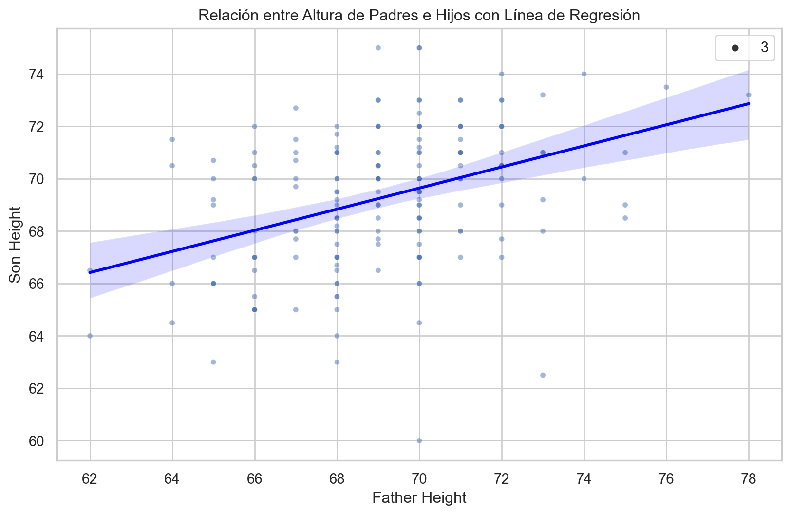 import pandas as pdimport numpy as npimport matplotlib.pyplot as pltimport seaborn as sns# Cálculo de las medias y desviaciones estándarmu_x = galton_heights['father'].mean()mu_y = galton_heights['son'].mean()s_x = galton_heights['father'].std()s_y = galton_heights['son'].std()# Cálculo del coeficiente de correlaciónr = galton_heights['father'].corr(galton_heights['son'])# Cálculo de la pendiente y el intercepto para la línea de regresiónm = r * s_y / s_xb = mu_y - m * mu_x# Configuración del tamaño de la figuraplt.figure(figsize=(10, 6))# Crear un gráfico de dispersión con línea de regresiónsns.scatterplot(x='father', y='son', data=galton_heights, alpha=0.5, size=3)sns.regplot(x='father', y='son', data=galton_heights, scatter=False, color='red', line_kws={'color': 'blue'})plt.xlabel("Father Height")plt.ylabel("Son Height")plt.title("Relación entre Altura de Padres e Hijos con Línea de Regresión")plt.show()