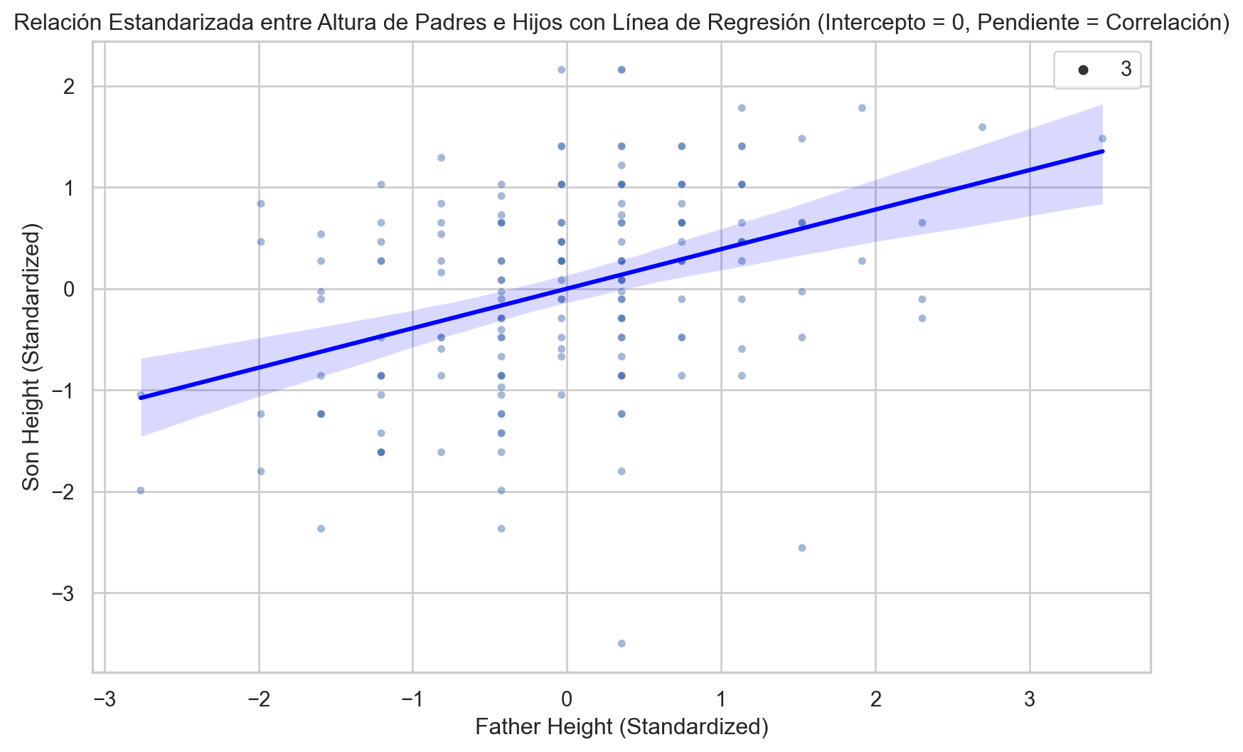 import pandas as pdimport numpy as npimport matplotlib.pyplot as pltimport seaborn as sns# Supongamos que tienes un DataFrame llamado 'galton_heights' con las columnas 'father' y 'son'.# Estandarizar las variables 'father' y 'son'galton_heights['father_standardized'] = (galton_heights['father'] - galton_heights['father'].mean()) / galton_heights['father'].std()galton_heights['son_standardized'] = (galton_heights['son'] - galton_heights['son'].mean()) / galton_heights['son'].std()# Calcular la correlación de las variables estandarizadasr = galton_heights['father_standardized'].corr(galton_heights['son_standardized'])# Configuración del tamaño de la figuraplt.figure(figsize=(10, 6))# Crear un gráfico de dispersión con línea de regresiónsns.scatterplot(x='father_standardized', y='son_standardized', data=galton_heights, alpha=0.5, size=3)sns.regplot(x='father_standardized', y='son_standardized', data=galton_heights, scatter=False, color='red', line_kws={'color': 'blue'})plt.xlabel("Father Height (Standardized)")plt.ylabel("Son Height (Standardized)")plt.title("Relación Estandarizada entre Altura de Padres e Hijos con Línea de Regresión (Intercepto = 0, Pendiente = Correlación)")plt.show()