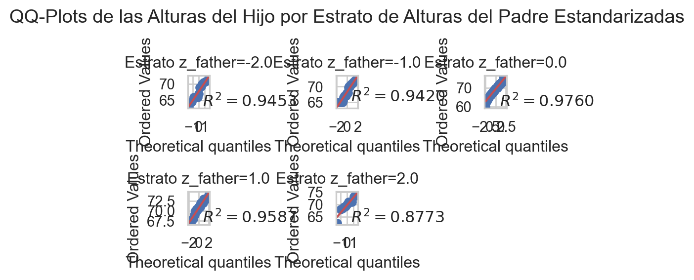 # Configurar el tamaño de la figura y el estilo de Seabornplt.figure(figsize=(5, 3))sns.set(style='whitegrid')# Crear gráficos QQ-plot utilizando un bucle for para cada estratofor z_father_value, group_data in galton_heights_filtered.groupby('z_father'): plt.subplot(2, 3, int(z_father_value) +3) # Convertir z_father_value a entero stats.probplot(group_data['son'], plot=plt, fit=True, rvalue=True) plt.title(f"Estrato z_father={z_father_value}")# Ajustar títulos y etiquetasplt.suptitle("QQ-Plots de las Alturas del Hijo por Estrato de Alturas del Padre Estandarizadas")plt.tight_layout()# Mostrar el gráficoplt.show()