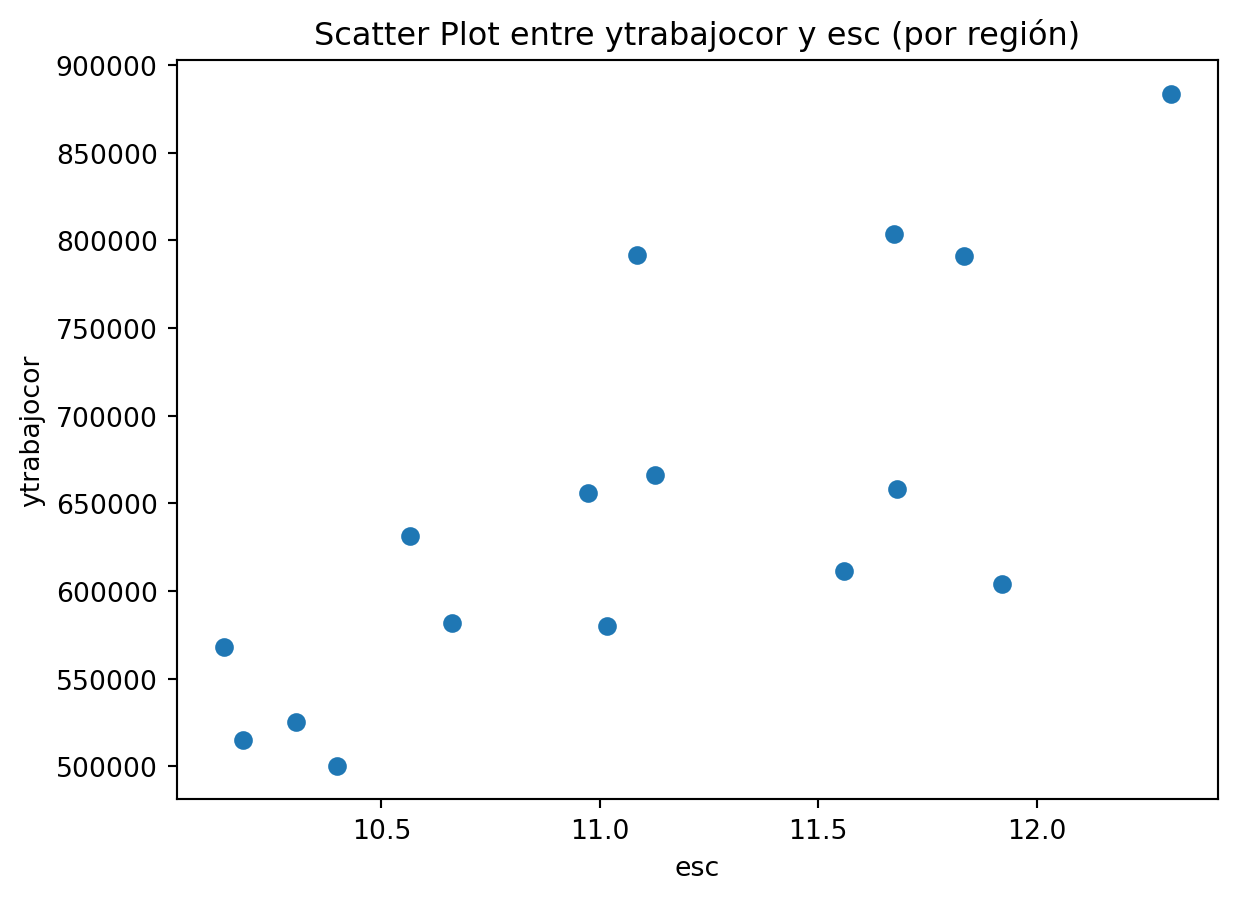 import matplotlib.pyplot as plt# Suponiendo que casen_2022 es tu DataFrameplt.scatter( casen_2022_region['esc'], casen_2022_region['ytrabajocor'],)plt.ylabel('ytrabajocor')plt.xlabel('esc')plt.title('Scatter Plot entre ytrabajocor y esc (por región)')plt.show()