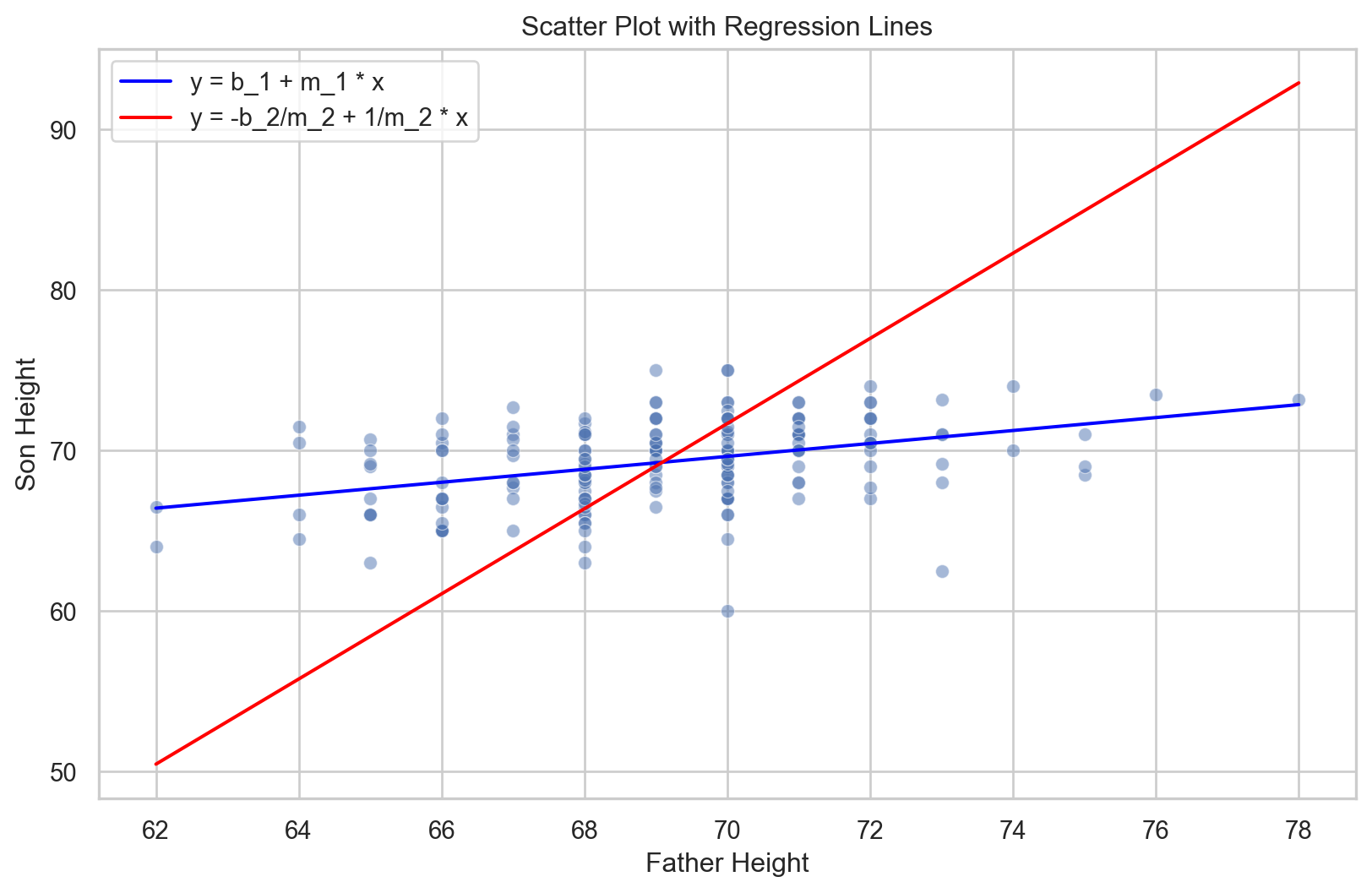 import matplotlib.pyplot as pltimport seaborn as sns# Crear el gráfico utilizando Matplotlib y Seabornplt.figure(figsize=(10, 6))sns.scatterplot(data=galton_heights, x='father', y='son', alpha=0.5)plt.plot(galton_heights['father'], b_1 + m_1 * galton_heights['father'], color='blue', label='y = b_1 + m_1 * x')plt.plot(galton_heights['father'], -b_2/m_2 +1/m_2 * galton_heights['father'], color='red', label='y = -b_2/m_2 + 1/m_2 * x')plt.legend()plt.xlabel('Father Height')plt.ylabel('Son Height')plt.title('Scatter Plot with Regression Lines')plt.show()