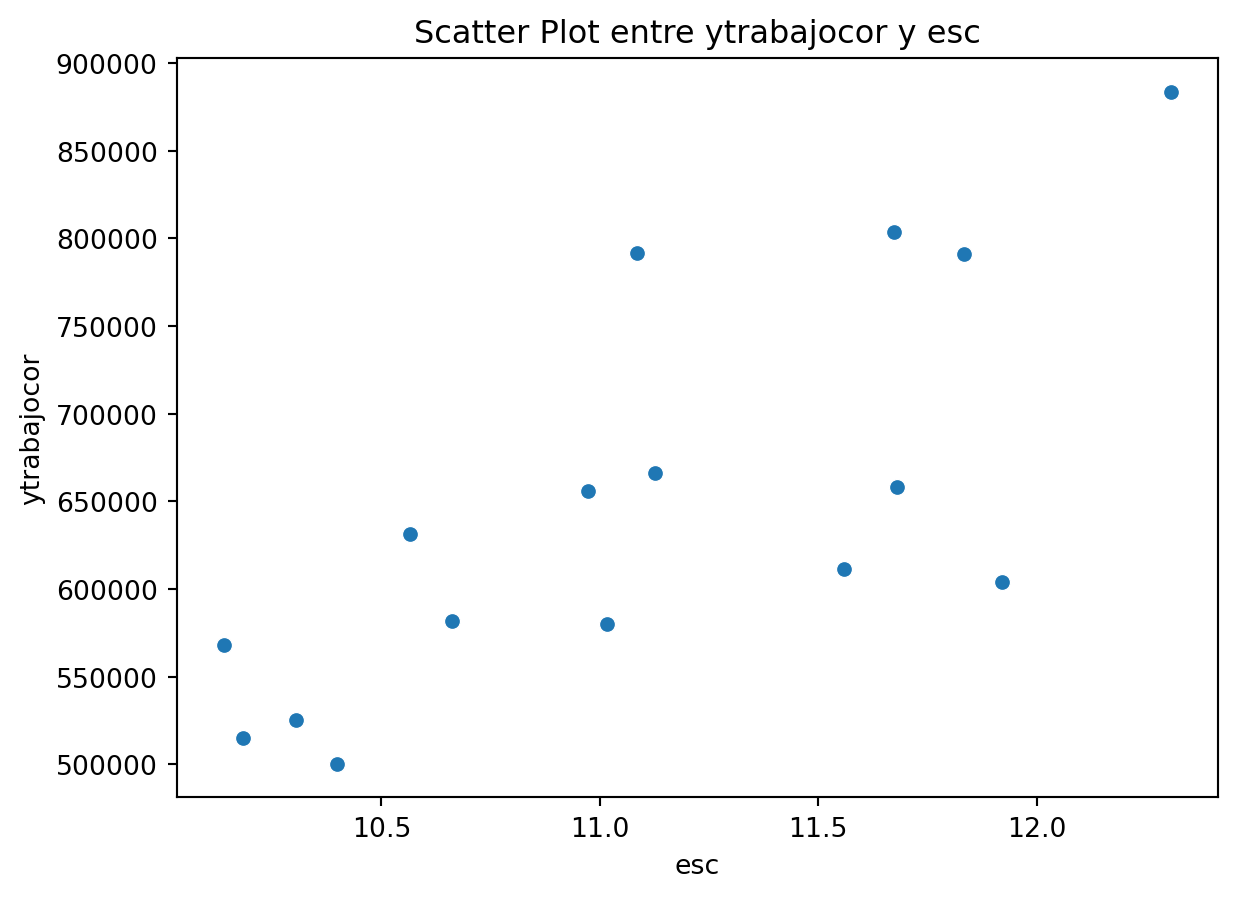 import seaborn as snsimport matplotlib.pyplot as plt# Suponiendo que casen_2022 es tu DataFramesns.scatterplot(data=casen_2022_region, y='ytrabajocor', x='esc')plt.ylabel('ytrabajocor')plt.xlabel('esc')plt.title('Scatter Plot entre ytrabajocor y esc')plt.show()