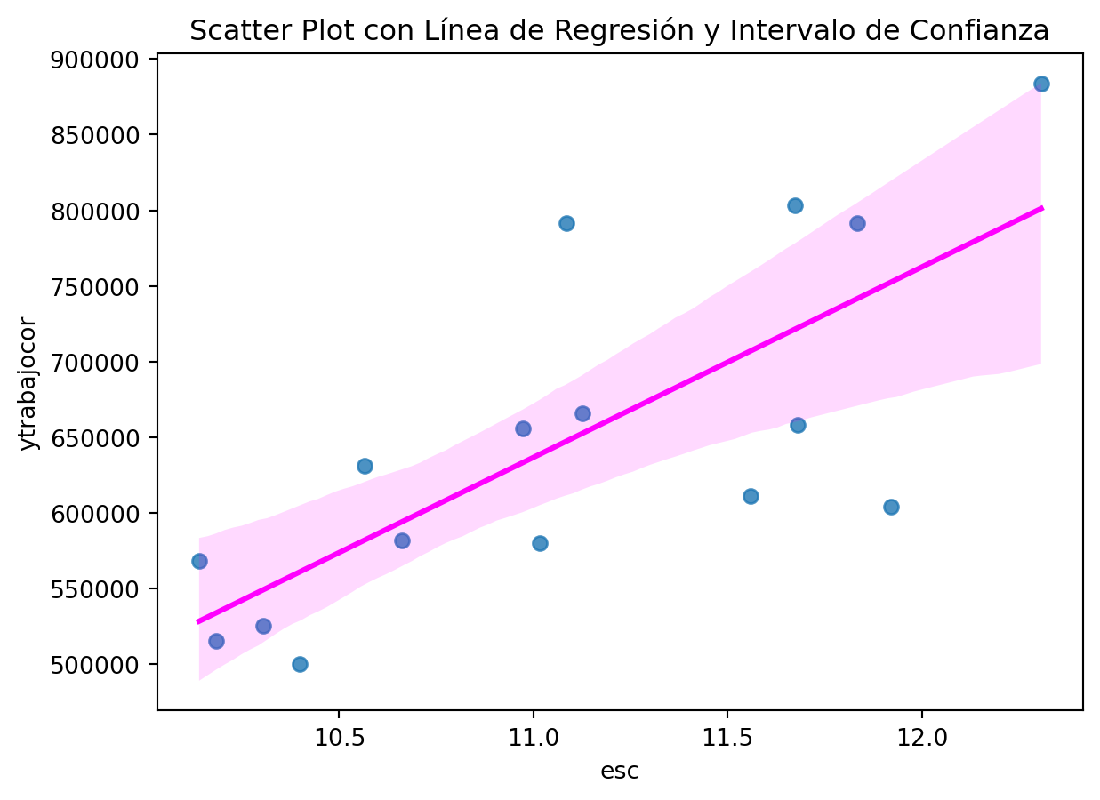 import seaborn as snsimport matplotlib.pyplot as plt# Suponiendo que casen_2022 es tu DataFramesns.regplot(data=casen_2022_region, y='ytrabajocor', x='esc', ci=95, line_kws={'color': 'magenta'}) # El argumento ci controla el intervalo de confianzaplt.ylabel('ytrabajocor')plt.xlabel('esc')plt.title('Scatter Plot con Línea de Regresión y Intervalo de Confianza')plt.show()
