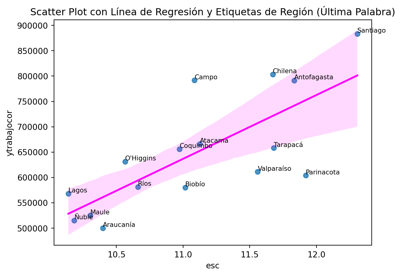 import seaborn as snsimport matplotlib.pyplot as plt# Suponiendo que casen_2022_region es tu DataFramesns.regplot(data=casen_2022_region, y='ytrabajocor', x='esc', ci=95, line_kws={'color': 'magenta'}) # El argumento ci controla el intervalo de confianza# Procesar y agregar etiquetas de región a los puntosfor i, label inenumerate(casen_2022_region['region']): last_word = label.split()[-1] # Obtener la última palabra de la etiqueta plt.text(casen_2022_region['esc'][i], casen_2022_region['ytrabajocor'][i], last_word, fontsize=8, ha='left', va='bottom')plt.ylabel('ytrabajocor')plt.xlabel('esc')plt.title('Scatter Plot con Línea de Regresión y Etiquetas de Región (Última Palabra)')plt.show()