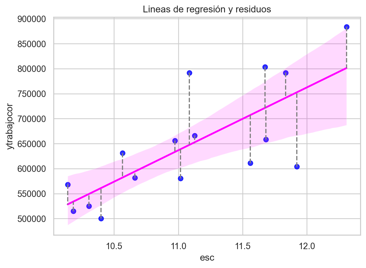 import seaborn as snsimport matplotlib.pyplot as pltimport numpy as npimport statsmodels.api as sm# Suponiendo que casen_2022_region es tu DataFramesns.set(style='whitegrid') # Configuración del estilo del gráfico# Agregar una columna de constante al DataFramecasen_2022_region['constante'] =1# Crear el gráfico de dispersión con la línea de regresiónsns.regplot(data=casen_2022_region, y='ytrabajocor', x='esc', ci=95, line_kws={'color': 'magenta'}, scatter_kws={'color': 'blue'}) # El argumento ci controla el intervalo de confianza# Ajustar el modelo de regresión linealy = casen_2022_region['ytrabajocor']X = casen_2022_region[['esc', 'constante']] # 'constante' es la columna que agregamos para el término constantemodelo = sm.OLS(y, X).fit()# Calcular las predicciones ('ytrabajocor_pred') a partir del modelocasen_2022_region['ytrabajocor_pred'] = modelo.predict(X)# Agregar líneas que conecten cada punto a la línea de regresiónfor i inrange(len(casen_2022_region)): x_point = casen_2022_region['esc'][i] y_point = casen_2022_region['ytrabajocor'][i] y_pred = casen_2022_region['ytrabajocor_pred'][i] # Usamos las predicciones del modelo# Línea que conecta el punto a la línea de regresión plt.plot([x_point, x_point], [y_point, y_pred], linestyle='--', color='gray')plt.ylabel('ytrabajocor')plt.xlabel('esc')plt.title('Lineas de regresión y residuos')plt.show()