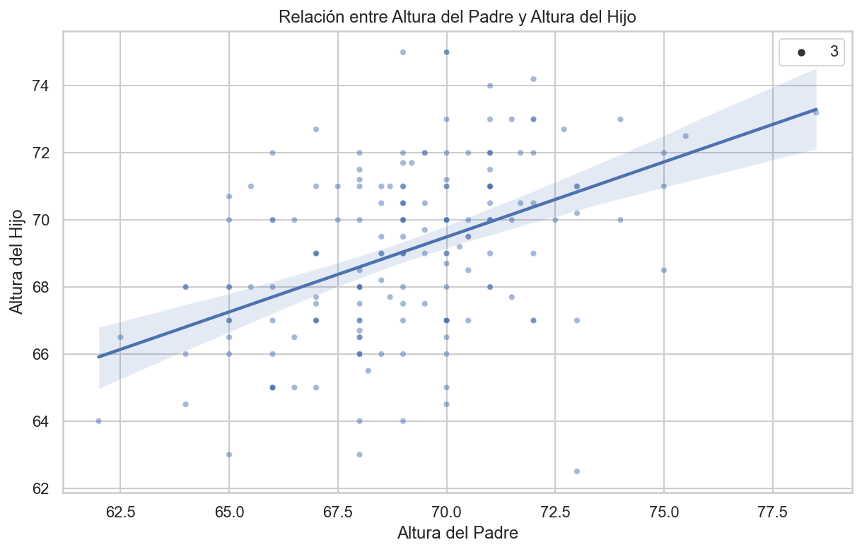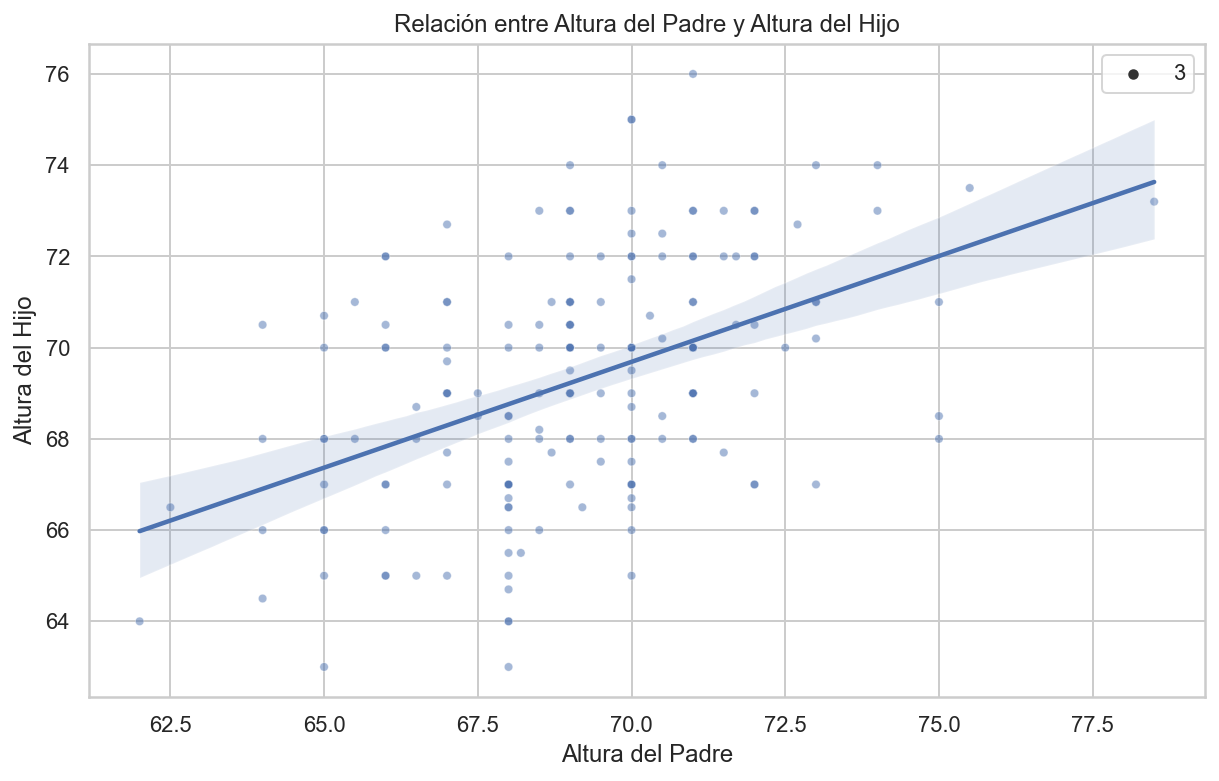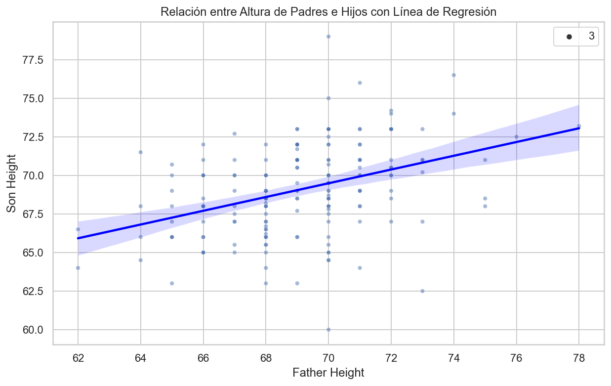 import pandas as pdimport numpy as npimport matplotlib.pyplot as pltimport seaborn as sns# Cálculo de las medias y desviaciones estándarmu_x = galton_heights['father'].mean()mu_y = galton_heights['son'].mean()s_x = galton_heights['father'].std()s_y = galton_heights['son'].std()# Cálculo del coeficiente de correlaciónr = galton_heights['father'].corr(galton_heights['son'])# Cálculo de la pendiente y el intercepto para la línea de regresiónm = r * s_y / s_xb = mu_y - m * mu_x# Configuración del tamaño de la figuraplt.figure(figsize=(10, 6))# Crear un gráfico de dispersión con línea de regresiónsns.scatterplot(x='father', y='son', data=galton_heights, alpha=0.5, size=3)sns.regplot(x='father', y='son', data=galton_heights, scatter=False, color='red', line_kws={'color': 'blue'})plt.xlabel("Father Height")plt.ylabel("Son Height")plt.title("Relación entre Altura de Padres e Hijos con Línea de Regresión")plt.show()