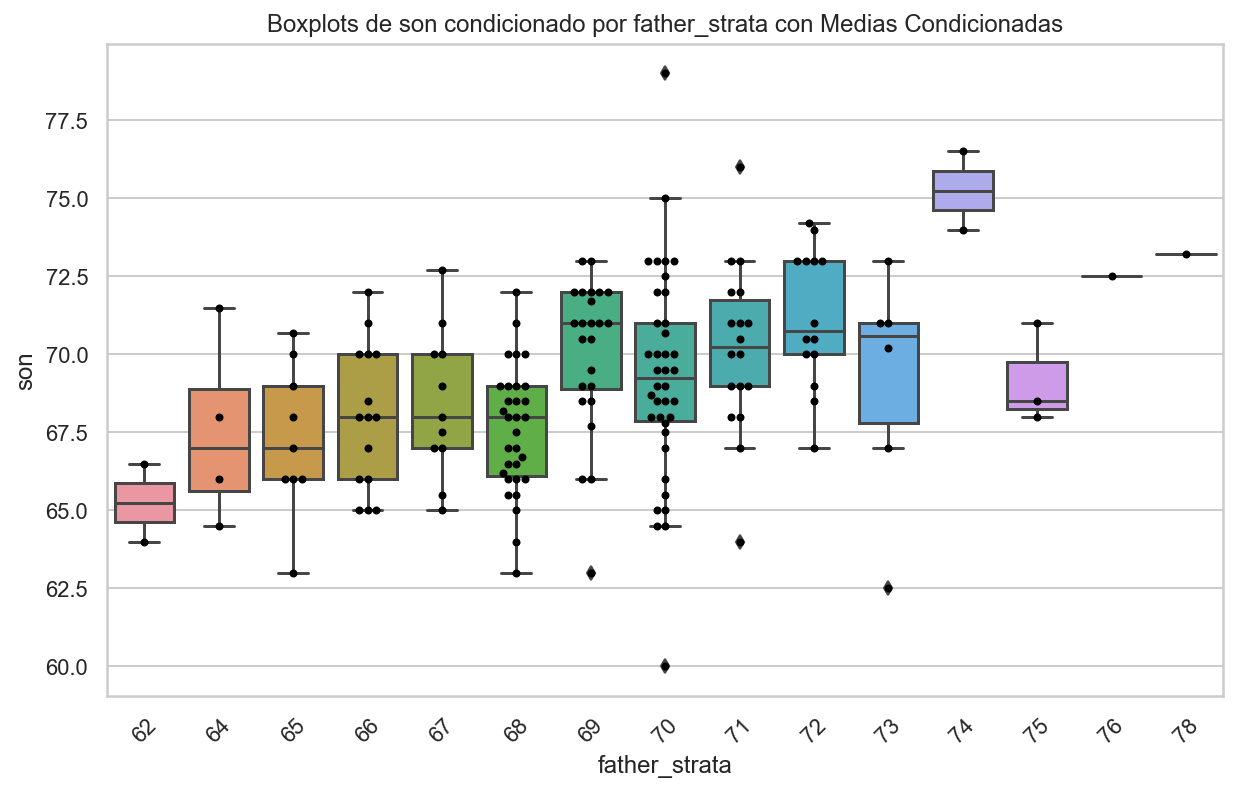 import pandas as pdimport seaborn as snsimport matplotlib.pyplot as plt# Supongamos que tienes un DataFrame llamado 'galton_heights' con las columnas 'father' y 'son'.# Crear una nueva columna 'father_strata' con los valores redondeados de 'father'galton_heights['father_strata'] = galton_heights['father'].round().astype(int)# Crear el gráfico de boxplotsplt.figure(figsize=(10, 6)) # Tamaño del gráficosns.boxplot(data=galton_heights, x='father_strata', y='son')# Agregar puntos para mostrar las medias condicionadassns.swarmplot(data=galton_heights, x='father_strata', y='son', color='black', size=4)plt.xlabel('father_strata')plt.ylabel('son')plt.title('Boxplots de son condicionado por father_strata con Medias Condicionadas')plt.xticks(rotation=45) # Rotar etiquetas del eje x si es necesarioplt.show()