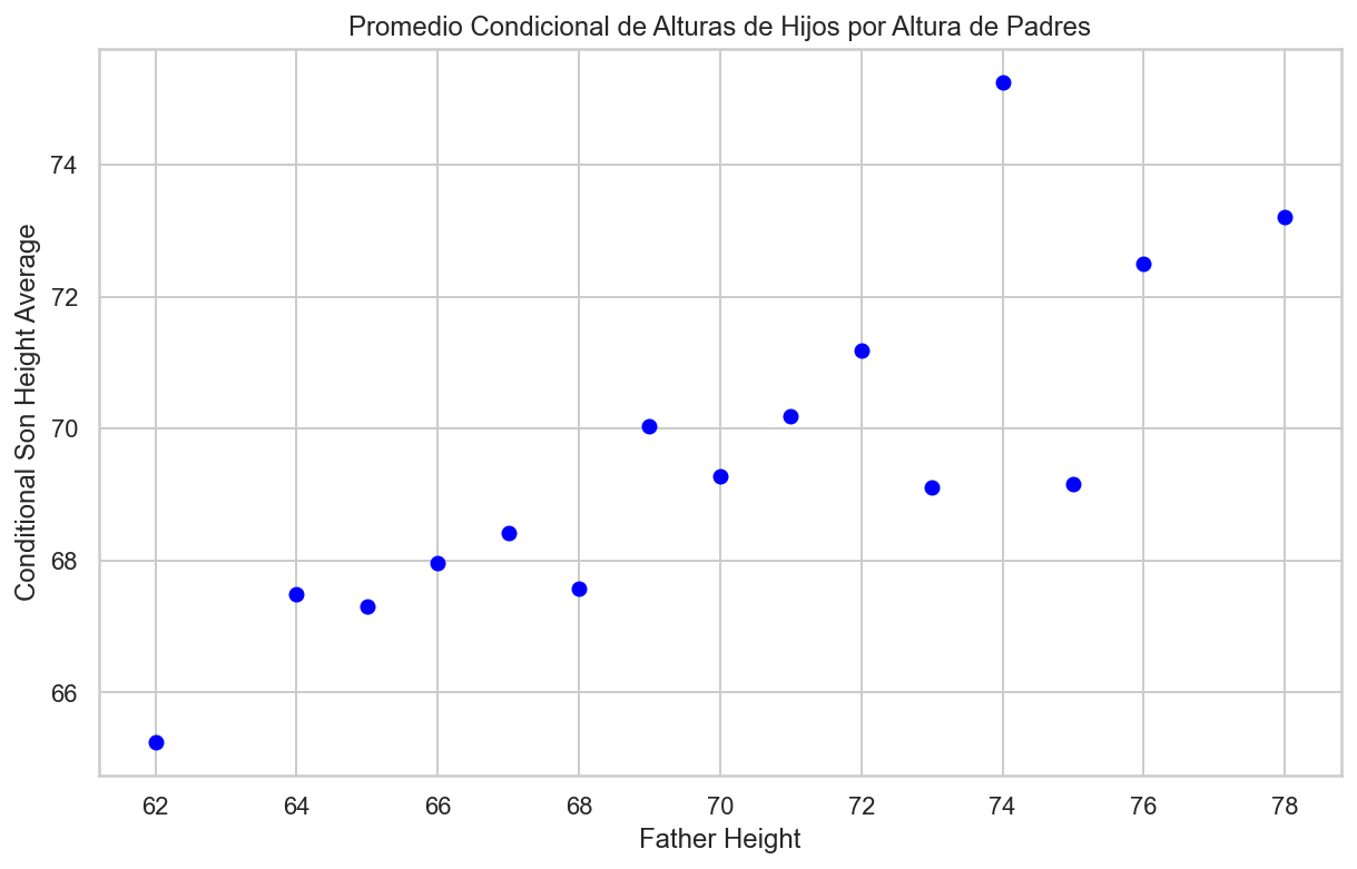 import pandas as pdimport matplotlib.pyplot as plt# Redondear los valores de la columna "father"galton_heights['father'] = galton_heights['father'].round()# Calcular el promedio condicional de "son" para cada valor de "father"conditional_avg_by_father = galton_heights.groupby('father')['son'].mean().reset_index()# Crear un gráfico de puntos para mostrar el promedio condicional por "father"plt.figure(figsize=(10, 6))plt.scatter(conditional_avg_by_father['father'], conditional_avg_by_father['son'], color='blue')plt.xlabel("Father Height")plt.ylabel("Conditional Son Height Average")plt.title("Promedio Condicional de Alturas de Hijos por Altura de Padres")plt.show()