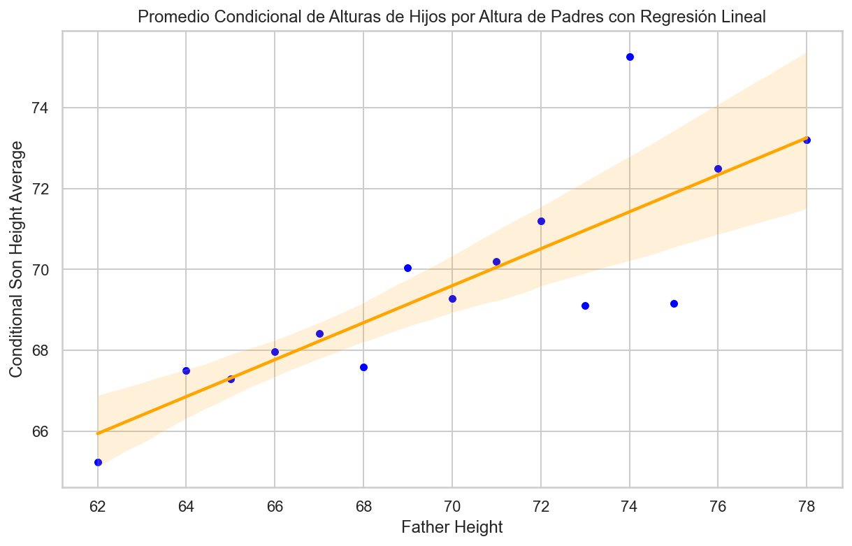import pandas as pdimport matplotlib.pyplot as pltimport seaborn as sns# Redondear los valores de la columna "father"galton_heights['father'] = galton_heights['father'].round()# Calcular el promedio condicional de "son" para cada valor de "father"conditional_avg_by_father = galton_heights.groupby('father')['son'].mean().reset_index()conditional_avg_by_father.head()# Crear un gráfico de puntos con ajuste de regresión linealplt.figure(figsize=(10, 6))sns.scatterplot(x='father', y='son', data=conditional_avg_by_father, color='blue')sns.regplot(x='father', y='son', data=conditional_avg_by_father, scatter=False, color='orange')plt.xlabel("Father Height")plt.ylabel("Conditional Son Height Average")plt.title("Promedio Condicional de Alturas de Hijos por Altura de Padres con Regresión Lineal")plt.show()