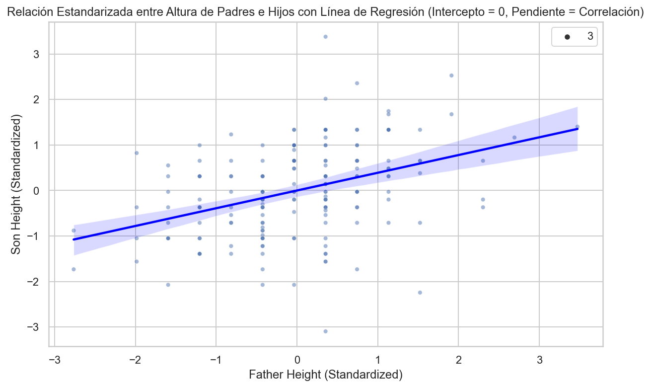 import pandas as pdimport numpy as npimport matplotlib.pyplot as pltimport seaborn as sns# Supongamos que tienes un DataFrame llamado 'galton_heights' con las columnas 'father' y 'son'.# Estandarizar las variables 'father' y 'son'galton_heights['father_standardized'] = (galton_heights['father'] - galton_heights['father'].mean()) / galton_heights['father'].std()galton_heights['son_standardized'] = (galton_heights['son'] - galton_heights['son'].mean()) / galton_heights['son'].std()# Calcular la correlación de las variables estandarizadasr = galton_heights['father_standardized'].corr(galton_heights['son_standardized'])# Configuración del tamaño de la figuraplt.figure(figsize=(10, 6))# Crear un gráfico de dispersión con línea de regresiónsns.scatterplot(x='father_standardized', y='son_standardized', data=galton_heights, alpha=0.5, size=3)sns.regplot(x='father_standardized', y='son_standardized', data=galton_heights, scatter=False, color='red', line_kws={'color': 'blue'})plt.xlabel("Father Height (Standardized)")plt.ylabel("Son Height (Standardized)")plt.title("Relación Estandarizada entre Altura de Padres e Hijos con Línea de Regresión (Intercepto = 0, Pendiente = Correlación)")plt.show()
