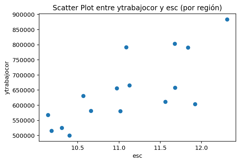 import matplotlib.pyplot as plt# Suponiendo que casen_2022 es tu DataFrameplt.scatter( casen_2022_region['esc'], casen_2022_region['ytrabajocor'],)plt.ylabel('ytrabajocor')plt.xlabel('esc')plt.title('Scatter Plot entre ytrabajocor y esc (por región)')plt.show()