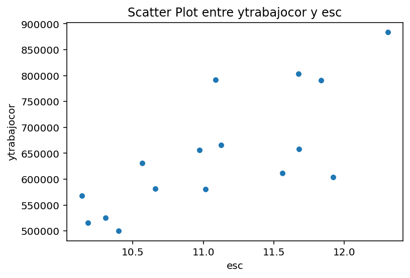 import seaborn as snsimport matplotlib.pyplot as plt# Suponiendo que casen_2022 es tu DataFramesns.scatterplot(data=casen_2022_region, y='ytrabajocor', x='esc')plt.ylabel('ytrabajocor')plt.xlabel('esc')plt.title('Scatter Plot entre ytrabajocor y esc')plt.show()