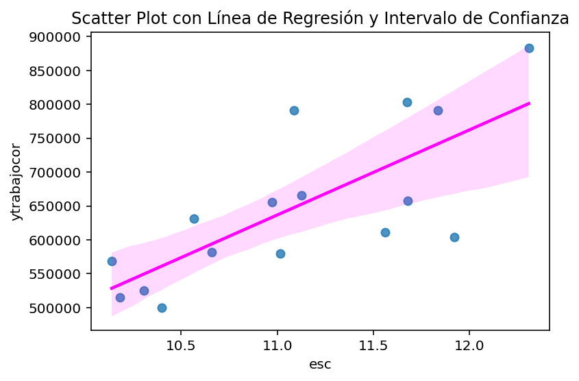 import seaborn as snsimport matplotlib.pyplot as plt# Suponiendo que casen_2022 es tu DataFramesns.regplot(data=casen_2022_region, y='ytrabajocor', x='esc', ci=95, line_kws={'color': 'magenta'}) # El argumento ci controla el intervalo de confianzaplt.ylabel('ytrabajocor')plt.xlabel('esc')plt.title('Scatter Plot con Línea de Regresión y Intervalo de Confianza')plt.show()