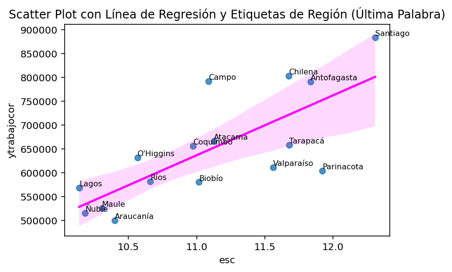 import seaborn as snsimport matplotlib.pyplot as plt# Suponiendo que casen_2022_region es tu DataFramesns.regplot(data=casen_2022_region, y='ytrabajocor', x='esc', ci=95, line_kws={'color': 'magenta'}) # El argumento ci controla el intervalo de confianza# Procesar y agregar etiquetas de región a los puntosfor i, label inenumerate(casen_2022_region['region']): last_word = label.split()[-1] # Obtener la última palabra de la etiqueta plt.text(casen_2022_region['esc'][i], casen_2022_region['ytrabajocor'][i], last_word, fontsize=8, ha='left', va='bottom')plt.ylabel('ytrabajocor')plt.xlabel('esc')plt.title('Scatter Plot con Línea de Regresión y Etiquetas de Región (Última Palabra)')plt.show()