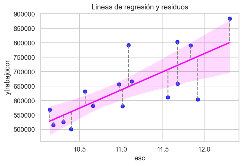 \(\epsilon\): es el residuo o error, la diferencia entre el valor observado y el estimado por el modelo. Recoge el efecto de todas aquellas variables que influyen en \(y\) pero que no se incluyen en el modelo como predictores.