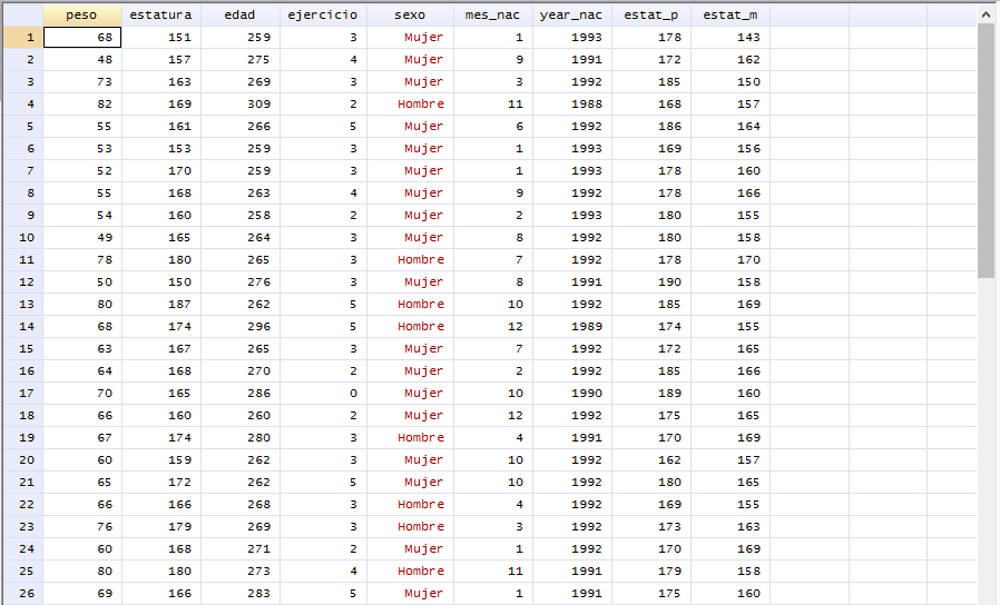 Ejemplo: Sexo (h, m), zona de residencia (urbano, rural)